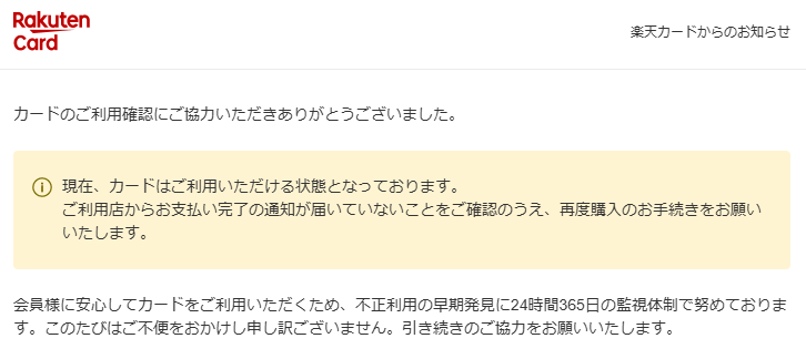 なぜこんなことが起こったかというと、つまりは「いつもの買い物に比べて高いぞ! 不正利用かも?!」と楽天カードさんの不正検知システムに引っ掛かってしまったワケですね。